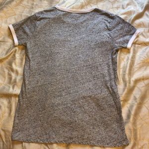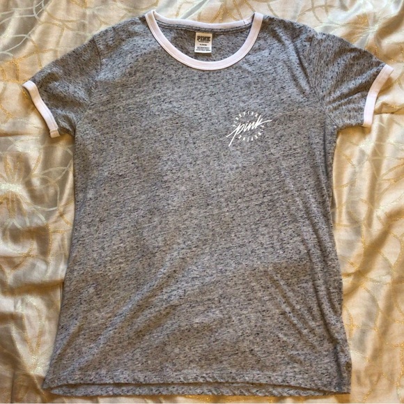 Heather gray PINK ringer t shirt. White around neck and sleeves. PINK written in white on upper chest area. Relaxed fit. Worn once.