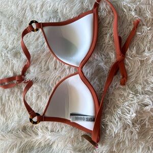 Rust color fixed triangle bikini top with molded cups, ring detail