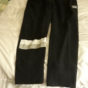 Black sweats have a white and black stripe on one of the lower legs in front have draw string and a pink logo on the front left leg.