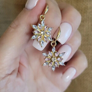 Dainty crystal shimmer snowflakes trimmed in 16k goldplate on hypoallergenic wires.