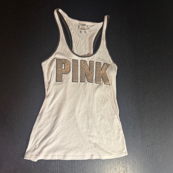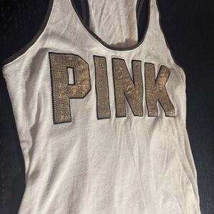Chic tank top with bold gold sequins PINK logo. Ideal for casual wear or workout. Can be worn as a cover up or layered.