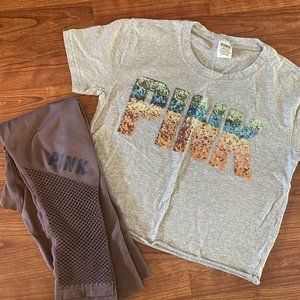 PINK (By Victoria's Secret crop top and leggings. Comfy crop that doesn't come too high and the perfect stretchy leggings that are soft, yet sturdy. Perfect for working out or running errands on a Saturday. Items can be sold separately. Shirt is a size Small and Leggings are a size Medium.