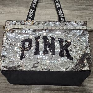 PINK Silver & Black Sequin Large Overnight Tote Carry All Beach Bag. Preowned condition, the straps have some letters wore off.