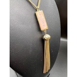 Long necklace with a long rectangle pink stone with gold chain fringe detail.