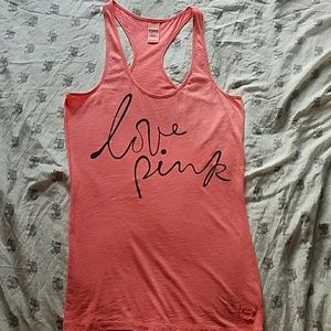 Love pink in cursive with cross back Thin material Never worn only washed and hung