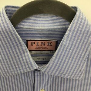 PINK Thomas Pink Prestige Striped Shirt Button Barrel Cuff Blue Size 16/34