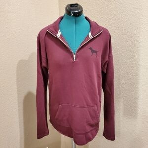 PINK Victoria's Secret quarter zip long sleeve pullover mediumweight sweatshirt. Front Kangaroo pocket. Maroon with black dog shilolette on front left chest. Back PINK spellout black & white embroidery patch style. 60% cotton 40% polyester.