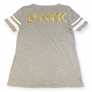 Comfy and classic PINK Victoria’s Secret gray V-neck tee with sporty white varsity stripe sleeves and gold sequin PINK logo on the back. Super soft stretch knit perfect for lounging, layering, or casual everyday wear.