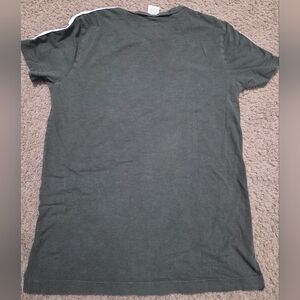 This is a flawed item so please read carefully. The shirt is an olive green color. There is a streak and a spot on the front as pictured. I haven't tried to remedy them so they may come out.