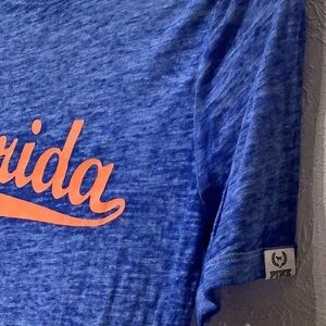 Nicely blue patterned transparent tee with almost neon orange writing in front FLORIDA