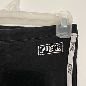 - solid black with white rectangle spellout "PINK" logo front and white double side tape stripe repeating "PINK" spellout legging leggings