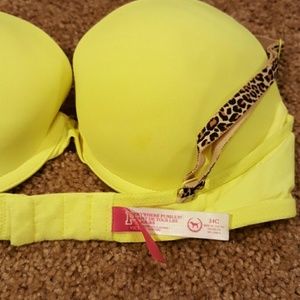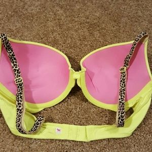 34C wear everywhere push up bra in neon yellow with leopard print straps and neon pick lining.