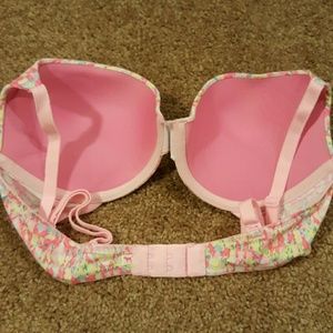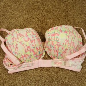 34C wear everywhere push up bra in a geometric print of pinks, blues, yellow and white.