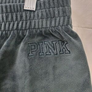 Stay cozy and stylish with these PINK joggers. Made from soft velour fabric, they feature an elastic waistband and cuffs for a comfortable fit. Perfect for lounging, running errands, or pairing with your favorite hoodie for a casual look. Color: dark green.