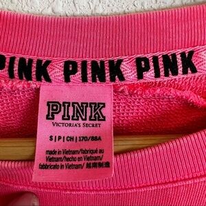 PINK Victoria Secret Campus Crew Side Zip Pullover. This was my daughters. The neon is fading throughout the sweater, not as vibrant color. Small hole noted on arm (see photo). This is a S/P.
