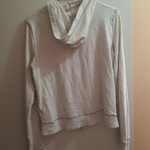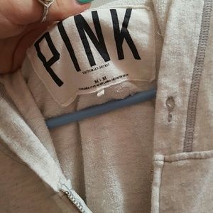 Victoria Secret PINK brand zip up jacket has small snag on the side where it got caught in something. Not noticeable. Fits more like a Small. Draw strings are missing