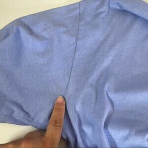 In preowned condition. Some discoloration throughout. Light spots on sleeve and areas between sleeve and pit. See approximate measurements in pictures. Lightweight. Color is blue with a hint of purple. 100% cotton.