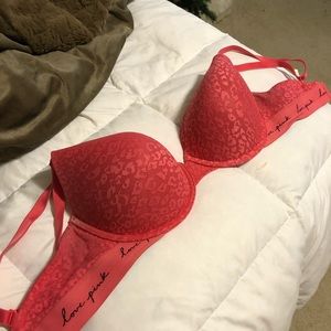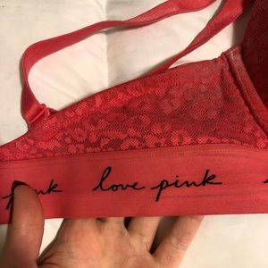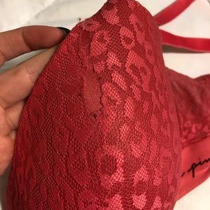 This is a pink Victoria Secret bra with lace cheetah print on the front. A strap that goes all the way around for support and lace on the sides. There are a few minor mess ups with the bra that I’ve shown in pictures like the messed up lace and wire poking out a little.