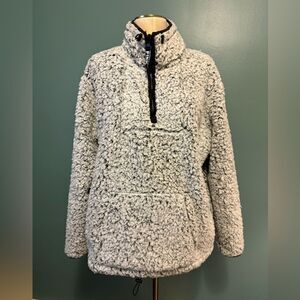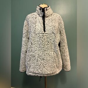 Fully lined sherpa material, 1/4 zip, light gray with black trim detail, front kangaroo pocket, size large