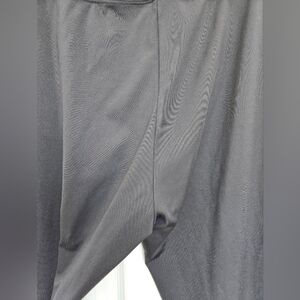 77% recycled polyester, 23% elastane. Black smooth material joggers with a high rise. Elastic waist and leg cuffs. PINK logo in reflective print on top front left hip. 2 side pockets. There is a pick on the left thigh area and 2 spots in the right leg towards the bottom, as shown. Size small petite.
