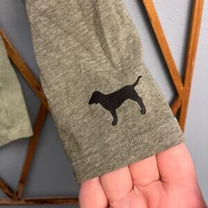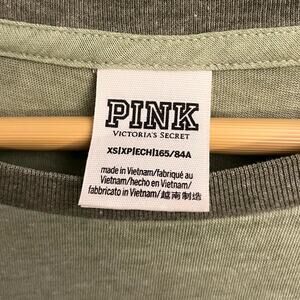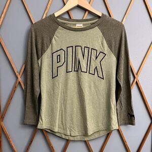 PINK Victoria’s Secret baseball t-shirt. Light green body with olive green sleeves. PINK graphic on chest and dog graphic on sleeve. Size XS