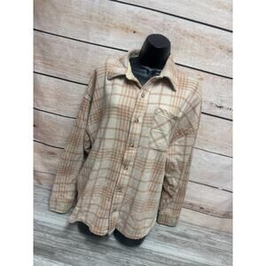 This women's size XS shacket features a stylish beige and plaid pattern.