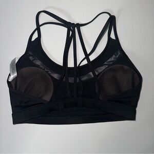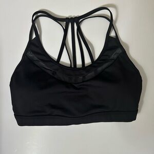 Stylish black sports bra with strappy back design. Comfortable and supportive for workouts.