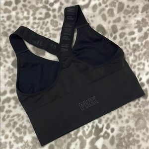 A black sports bra made of stretchy, form-fitting material with wide shoulder straps and a racerback style for additional support. Only worn a couple of times.