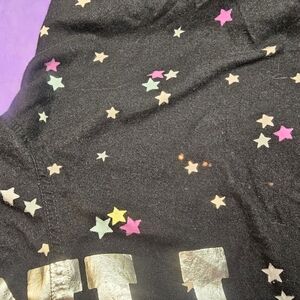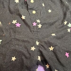Chic black and gray pajamas with pink and white star accents. Ideal for a playful style.some stains on the front and back