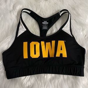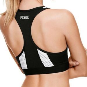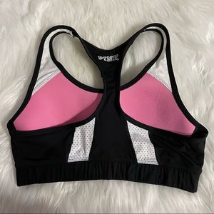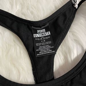 Stylish sports bra with bold orange lettering. Comfortable fit. Perfect for active wear.