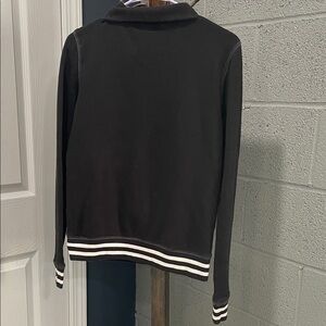 Chic black sweater with white trim. Features a quarter zip and embroidered '86' design. Ideal for casual outings.