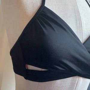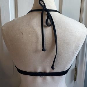 PINK Victoria’s Secret black bikini top with padded bra. Interior is pink. Hooks in back and ties around neck. Very good preowned condition. Size: Small