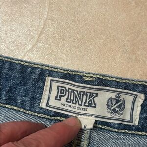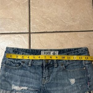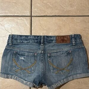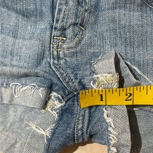 Stylish blue jean shorts. Features distressed details. Classic five-pocket design.