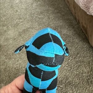 Charming plush with bold blue and black stripes. Features 'PINK' branding.