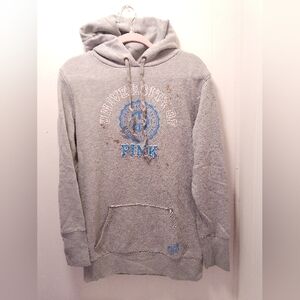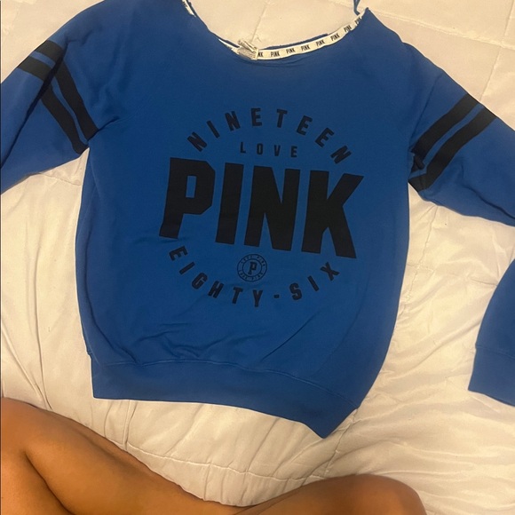 Trendy blue sweatshirt with bold PINK logo. Comfortable and stylish for on the goof the shoulders neck line