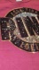 The shirt is burgundy, with black, silver, & bronze sequins with the brand's circular logo.