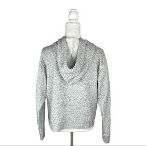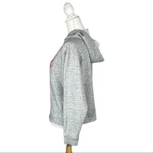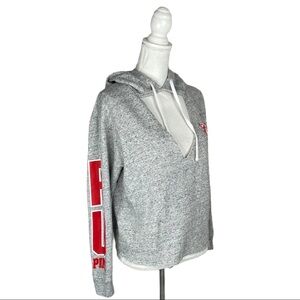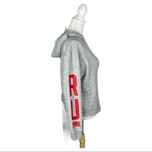 PINK, Victoria's Secret with 5th & Ocean, light grey colored hoodie, large triangle key hole, white draw string, Red Knit logo on chest, long sleeve with red and white RU on right sleeve, relaxed fit with a finished raw hem. No rips, stains or pulls.