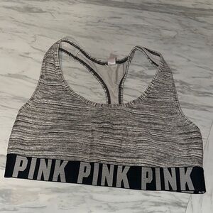 Chic sports bras from PINK Victoria's Secret. Features peach and heather gray designs. Ideal for active or casual wear.