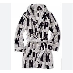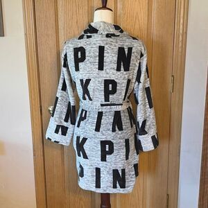 This robe is made by PINK. It’s a super soft gray with black PINK all over. Long sleeve, shorter length and a waist tie. Size XS and in excellent pre owned condition. Smoke and pet free home.