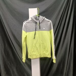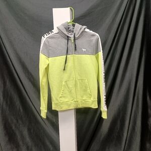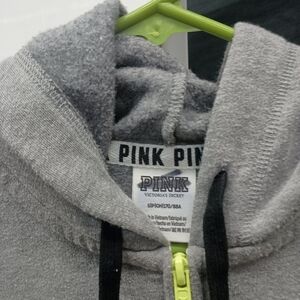 Cozy gray hoodie with black drawstrings. Features PINK logo.