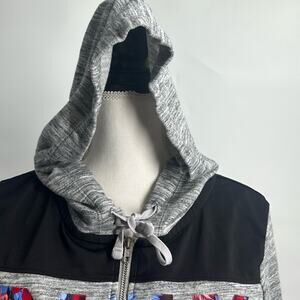 This stylish hoodie features a gray body with black panels on the upper chest and shoulders, complemented by a full-length zipper for easy wear. The hood matches the main body color, providing a cohesive look. Perfect for casual outings, this sweatshirt combines comfort with a modern design.
