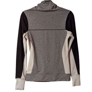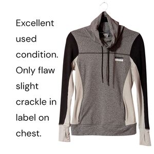 Stylish colorblock pull over with a sleek design. Perfect for casual outings. Has cowl neck with draw strings, thumb holes and two front pockets with zippers. Flaw- label has slight crackle. See pics for more details.