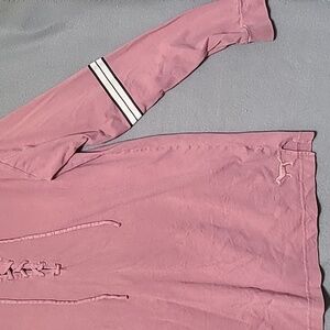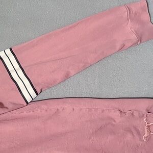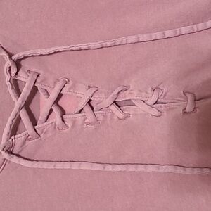 This pre-owned Victoria's Secret Pink lace-up long sleeve top features a solid pink color with the brand dog logo on the back. Made from 100% cotton, the relaxed fit t-shirt is machine washable and suitable for all seasons. The casual sleeve and lace-up neckline add a stylish touch to this basic yet trendy top, perfect for everyday wear.
