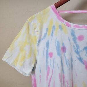 PINK Victoria's Secret tie dye crop tee, size extra small (XS). Short sleeves. Ladder back. Crew neckline. Red, yellow, and blue tie dye on white tee. Black logo dog graphic on front. Relaxed fit.