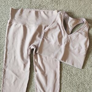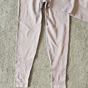 Stylish seamless lavender sports bra and leggings set. Perfect for workouts or casual wear. Has beautiful cutout detailing throughout. True to size medium. The top is missing tag but it is a medium. No flaws.