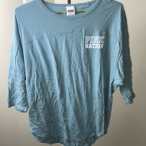 Light blue tee with bold PINK logo. Soft cotton fabric.