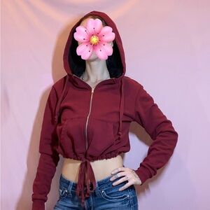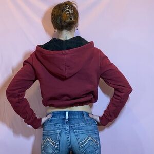 PINK Victoria’s Secret Burgundy zip-up hoodie with drawstring waist and black fuzzy hood