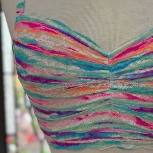 Vibrant multicolor stripe Bralette . Features a ruched design and adjustable straps.