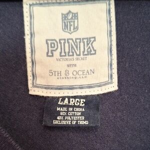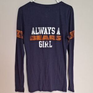 Navy top by PINK Victoria's Secret. Features an orange label with logo details. NFL collaboration, ALWAYS A BEARS GIRL on back side.