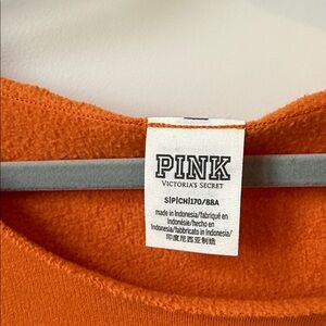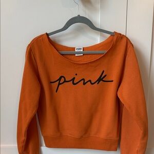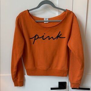 Vibrant orange pullover with black 'pink' logo. Casual and trendy.